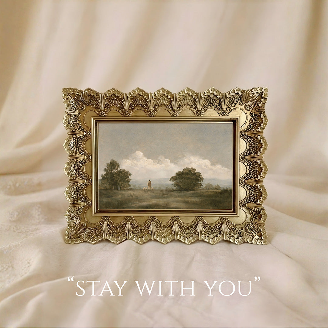 The final piece, Stay With You, is presented in a 8" × 10" vintage gold frame and features Jesus in a calm, serene setting—offering a moment of stillness and quiet reassurance.